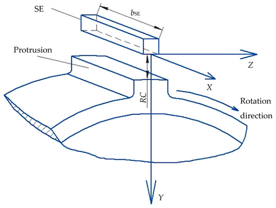 It should be noted that the use of SCECS for CJTB wear diagnostics requires the solution of two contradictory problems. On the one hand, the protrusion axial displacements associated with the wear of the bearing elements are small. That is why the maximum sensitivity of the sensor to the TPU’s rotor (measuring disk) displacements is required. On the other hand, the working range of the measured displacements should be wide enough because the dimensional chain in the direction of the rotor axis in addition to shaft displacements due to the CJTB wear contains other components related to the initial axial clearances in the bearing, tolerances on its dimensions, etc. Moreover, their value can significantly exceed displacements caused by the CJTB wear. To meet the requirements in the working range of the measured axial displacements the length of the SCECS’s SE is selected equal to the length of a protrusion of the measuring disk. The maximum possible sensitivity of the SCECS and the linearity of its characteristics are achieved due to the angular orientation of the sensor’s SE parallel to the protrusion tip. Figure 3 provides a schematic representation of the SCECS’s SE relative position with respect to the protrusion of the measuring disc. Here the selected Cartesian coordinate system OXYZ is shown. The origin of the coordinate system is attached to the SCECS’s SE, axis X characterizes the axial displacement of the measuring disc, axis Y—the RC between the SE and the protrusion, and axis Z—the protrusion’s linear displacement in the direction of the rotation of the measuring disc.