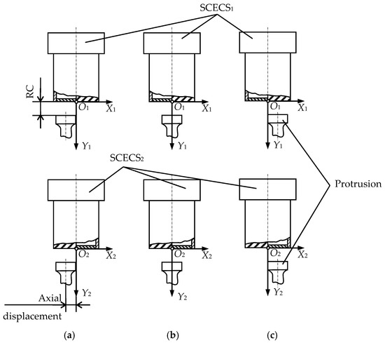 Figure 5 schematically shows the location of the protrusion of the measuring disk relative to the SE of SCECS1 and SE of SCECS2 at the moments when the axial displacement of the TPU rotor’s shaft is negative (Figure 5a), absent (Figure 5b) and positive (Figure 5c). The origins of local coordinate systems O1X1Y1 and O2X2Y2 are attached to the g.c. of SCECS1 and g.c. of SCECS2, respectively, the axis Z is not shown in Figure 5. To simplify the further reasoning, it is assumed that all the parameters of SCECS1 and SCECS2 as well as the parameters of MC1 and MC2 are identical.