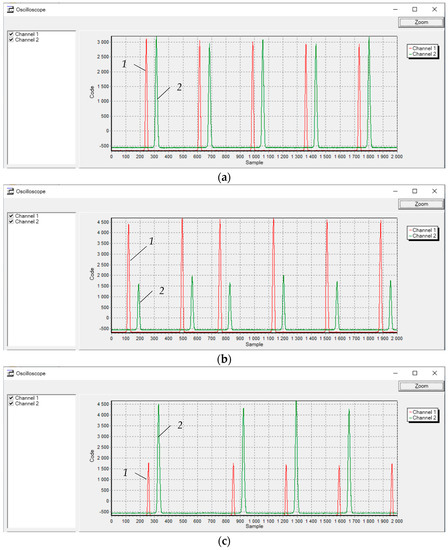 Figure 8 displays the screenshots of the program for scanning the measuring channels of the diagnostic system’s prototype. The results were obtained for the initial conditions specified above during the rotation of the measuring disc. The axial displacement of the disk relative to the g.c. of the SCECS was taken as 0 mm (Figure 8a), −2.0 mm (Figure 8b), and +2 mm (Figure 8c). The curve 1 (red) on the graphs corresponds to the protrusion’s passage under the SE of SCECS1 and curve 2 (green) corresponds to the protrusion’s passage under the SE of SCECS2.