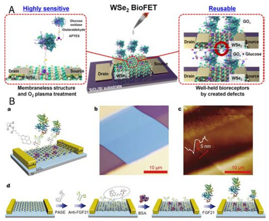 - Lee, H.W.; Kang, D.-H.; Cho, J.H.; Lee, S.; Jun, D.-H.; Park, J.-H. Highly sensitive and reusable membraneless field-effect transistor (FET)-type tungsten diselenide (WSe2) biosensors. ACS Appl. Mater. Interfaces. 2018, 10, 17639–17645. [Google Scholar] [CrossRef]