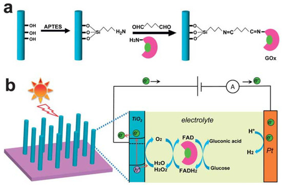 - Tang, J.; Wang, Y.; Li, J.; Da, P.; Geng, J.; Zheng, G. Sensitive enzymatic glucose detection by TiO2 nanowire photoelectrochemical biosensors. J. Mater. Chem. A Mater. 2014, 2, 6153–6157. [Google Scholar] [CrossRef]
