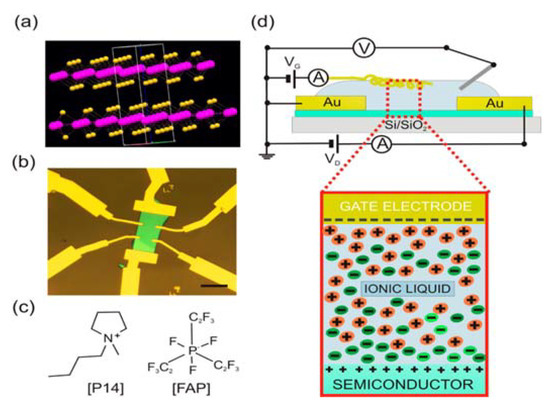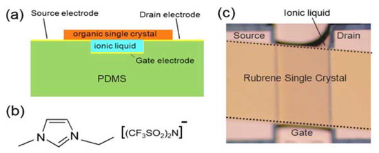 - Uemura, T.; Hirahara, R.; Tominari, Y.; Ono, S.; Seki, S.; Takeya, J. Electronic functionalization of solid-to-liquid interfaces between organic semiconductors and ionic liquids: Realization of very high performance organic single-crystal transistors. ApPhL 2008, 93, 263305. [Google Scholar] [CrossRef]
