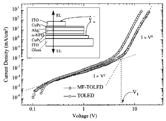 - Parthasarathy, G.; Burrows, P.E.; Khalfin, V.; Kozlov, V.G.; Forrest, S.R. A metal-free cathode for organic semiconductor devices. ApPhL 1998, 72, 2138–2140. [Google Scholar] [CrossRef]