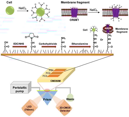 Schematic illustration of a surface plasmon resonance (SPR) biosensor with immobilized stable cells or membrane fragments expressing the olfactory receptor 6M1 (OR6M1). EDC, 1-Ethyl-3-(3-dimethylaminopropyl)carbodiimide hydrochloride; NHS, N-hydroxysuccinimide; CMD, carboxymethyl dextran; FC, flow channel; LED, light emitting diode; and 2D-CMOS, two dimensional-complementary metal oxide semiconductor.