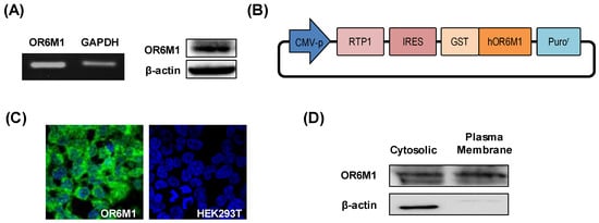 Characterization of OR6M1 expression. (A) Detection of OR6M1 expression in MCF-7 cells by reverse transcription–polymerase chain reaction (left) and western blotting (right). (B) Plasmid construct containing the receptor-transporting protein 1 (RTP1) gene, glutathione S-transferase (GST)-tag, and human OR6M1 gene. (C) Immunocytochemical detection of OR6M1 in the constructed OR6M1 cell line. GST-tagged OR6M1, green; nuclei, blue. Live cells, green; dead cells, red; (D) OR6M1 expression in cells and membrane fragments.