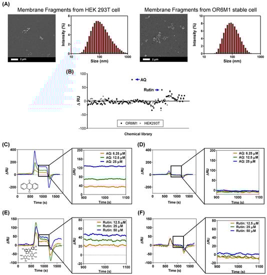 Identification of AQ and rutin as OR6M1 ligands using membrane fragment-immobilized SPR biosensor. (A) SEM images and size distributions of membrane fragments immobilized on a CMD50M sensor chip. (B) Membrane-fragment-based screening of 108 chemicals for ligand activity. (C,D) Sensorgrams of AQ at three different concentrations (6.25, 12.5, and 25 μM) using CMD50M-chip-immobilized OR6M1-expressing cell membranes (C) or HEK293T/17 cell membranes (D). (E,F) Sensorgrams of rutin at three different concentrations (12.5, 25, and 50 μM) using CMD50M-chip-immobilized OR6M1-expressing cell membranes (E) or HEK293T/17 cell membranes (F).