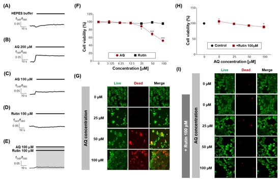 Effects of AQ and rutin on the breast cancer cell line, MCF-7. (A–E) Time response recording of [Ca2+]i in Fura-2AM-loaded MCF-7 cells after treatment with 4-(2-hydroxyethyl)-1-piperazineethanesulfonic acid (HEPES), AQ (100 and 200 μM), rutin (100 μM), and AQ + rutin. (F) Concentration-response curves of the MCF-7 cell viability (%) after treatment with AQ or rutin for 48 h. (G) Live/dead cell imaging of MCF-7 cells treated with AQ (25–100 μM) for 48 h. Live cells, green; dead cells, red. (H) Concentration-response curves of the MCF-7 cell viability (%) after co-treatment with different concentrations of AQ and 100 μM rutin for 48 h. (I) Live/dead cell imaging of MCF-7 cells treated with AQ + rutin for 48 h. The data are expressed as the mean ± standard deviation. * p < 0.05 and *** p < 0.001 untreated vs. ligand-treated cells (one-way analysis of variance and Dunnett’s post-test).