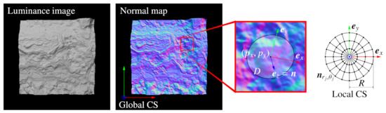 This elliptic region D describes a three-dimensional circular area distorted by projection onto the image plane, and the distortion is intended for extracting almost the same region regardless of the direction of the normal vector of the center pixel, . Although it requires that the neighbor region be flat to exactly extract the same region regardless of the direction of , elliptic distortion in Equation (2) is reasonable because the radius R is small and ellipses are projected as ellipses by a perspective projection. The local CS is defined by using this D as follows:
