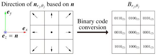 In this conversion, a normal is classified into 9 groups, while some methods for luminance images classify the luminance value into 2 or 3 groups [15,16,17,18]. The binary codes are set to describe which direction the neighbor normal points in based on the normal of the center pixel and form the space in the table with the Hamming distance. Although a code can describe at most groups, we designed the classification with an odd-times-odd table to robustly classify a normal similar to into the center cell. Finally, we obtain the BIFNOM feature vector which consists of .