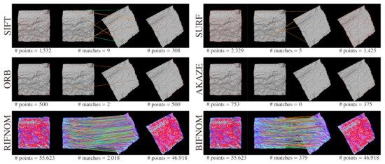 RIFNOM solved these problems in PHENOM by assigning a local coordinate system to each interest point and is capable of estimating continuous motion and deformation for each pair of corresponding interest points. Nevertheless, the performance of the RIFNOM feature has not been investigated sufficiently. Besides, the RIFNOM feature uses a heavy-weight descriptor that results in a huge amount of data and computations. As a result, it takes time to find a pair of corresponding interest points in RIFNOM. In luminance images, meanwhile, some binarized features such as BRIEF, ORB and BRISK [15,16,17] have been proposed, and these features involve less data and a lower amount of computation without significant degradation of distinctiveness. This technique will be useful also for features on normal maps.