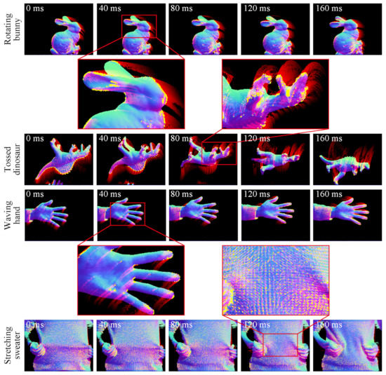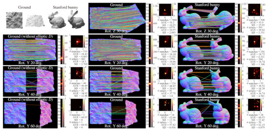 In all scenes in the figure, the proposed method detected and tracked interest points on normal maps in the same way on synthetic data. The interest points were detected mainly on bumpy surface or contours and this indicates the criteria in Equation (4) and the binary code extension for background worked as intended. Moreover, even when a target is non-rigid and includes unidentifiable repeated pattern like stitches in the stretching sweater scene, the proposed method succeeded in finding the correct pairs thanks to the criterion in Equation (8) and abolition of ratio test. However, some misleading interest points were detected and tracked where cast shadow occurred and correct normal vector cannot be obtained as the back ear shown in rotating bunny scene at . This deterioration arises from sensing, not the proposed method, and such problems can be improved by applying more sophisticated photometric stereo methods or a setup with more redundant lighting.