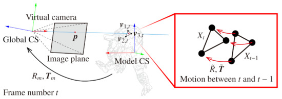 Furthermore, we also quantitatively evaluated the accuracy of the estimation of motion and deformation in sequential frames. We rendered sequential images by non-rigid body simulation [19] and prepared test sequence and ground truth. In this simulation, a 3D model “Armadillo” was moved and deformed according to gravity and user interaction, and the ground truth of the motion and deformation was derived based on . The vectors , and are the three-dimensional positions of three vertices that form a triangle mesh corresponding to a pixel of the rendered image whose frame number is t, as shown in Figure 5. Since all meshes of the 3D model were triangulated in advance, the number of vertices is always three. Besides, denotes the vertex in the previous frame.