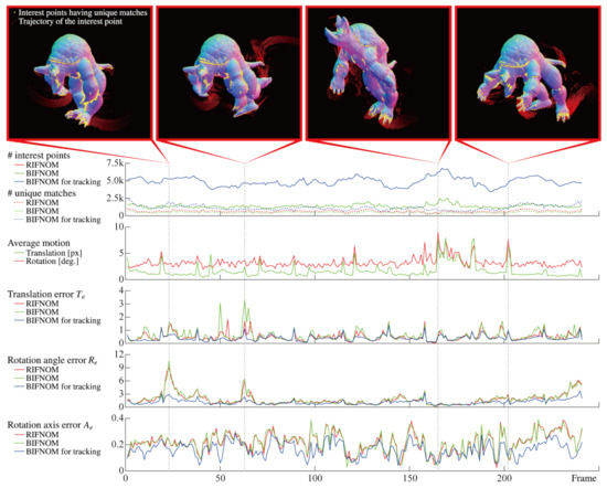 Finally, estimation results for motion and deformation are shown in Figure 6. Since the detection method is the same, the number of interest points of BIFNOM was equal to that of RIFNOM. On the other hand, BIFNOM for tracking can detect more interest points thanks to adding the background code mentioned in Section 3.7. Moreover, BIFNOM can find as many unique matches as RIFNOM and the graphs show the trend over frame was also similar. By assuming continuous motion with the Equation (8) and the background code, the number of unique matches was always larger than those of BIFNOM and RIFNOM. Besides, the figure shows that BIFNOM realized an estimation accuracy on the same order as RIFNOM. The estimated motion error of BIFNOM and RIFNOM can be spiky especially when the average motion was large but BIFNOM for tracking suppressed the error to be smaller. This arises from assumption of continuous motion. The estimation error of rotation is not small because the quantization error in the Equation (1) will affect minute rotation in sequential frames; however, Figure 4 shows good performance in the general case, and the estimation can be improved by statistical processes using neighbor matches. Denser motion estimation from each match will contribute to improving performance. In summary, BIFNOM was successfully extended to a light-weight feature based on RIFNOM without serious deterioration. Moreover, BIFNOM for tracking provided better results in sequential frames. Note that Figure 6 shows only a few frames among 241 frames; see the Supplementary Materials for the details of the whole sequence.