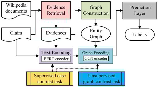 To help the model learn discriminative representations for different-class cases (claim-evidence pair), inspired by Reference [], we introduce a supervised contrast task to further fine tune the graph encoder and BRET-based encoder. In this task, the label information is used to enforce the encoder to distinguish different types of samples. Similarly, the case representation is the concatenation of claim-evidence pair and entity graph.
