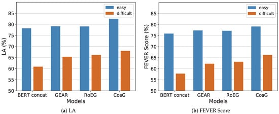 As shown in Figure 4a, we can find that the performance of models on the difficult development set are generally lower than the easy development set in terms of label accuracy, demonstrating that the main challenge of the fact verification task is to deal with the claims need multiple evidences to verify. In particular, we can see that the graph-based models, i.e., GEAR, RoEG, and CosG, show nearly 4.49–7.13% improvements compared to the no-graph baseline BERT concat on the difficult development set, which demonstrates that the graph structure can help capture the relations of multiple evidences for reasoning. Then, we focus on the comparison of our proposal against the baselines. We can find that our CosG gains 2.64% and 1.83% improvements against previous graph-based methods GEAR and RoEG, respectively. Such dominant performance can be explained by the fact that the graph-contrast block can help the GCN encoder learn unique entity information in the graph feature propagation, as well as the contrastive supervised task, can help model better distinguish different label claims.