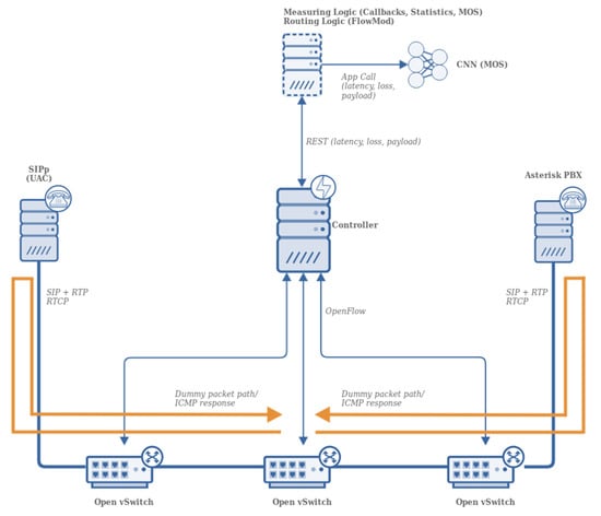 In this section, we describe the experimental setup we have used to implement the QoS statistics measurements in the SDN networks. The collection of data is based on the findings described in [,], but it is enhanced and further refined by adding speech quality estimation capabilities and reactive mechanisms that allow changing the routing of the media stream in the network, which is based on the calculation of the speech quality estimate.