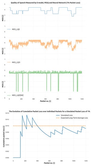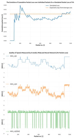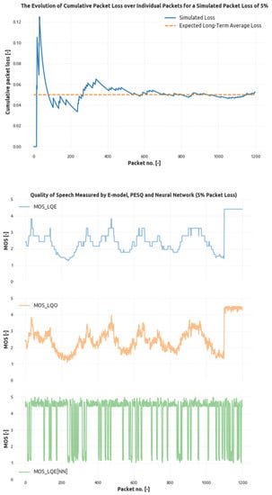As it is evident from the Figure 4 and Figure 5, the modeled quality of speech preserves a high correlation with PESQ results and detects the loss events correctly. In Figure 4, the first subfigure shows the evolution of a cumulative packet loss. The system was set to simulate the overall packet loss of 3% (orange dashed line), and the measured cumulative packet loss eventually fluctuates around this threshold. The peaks in the subfigure describe packet loss events, and as the time basis grows, the significance (or magnitude) of these peaks decreases. Further subfigures show the result of MOS measurement using E-Models PESQ and CNN respectively, where CNN again tends to penalize bursty losses due to the shorter time frame. The overall correlation of CNN with PESQ is clear; however, the occurrence of local minima in CNN-based model grows higher in areas where the PESQ result is lower.