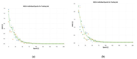 The convergence of the neural network model for both (a) training and (b) test sets (each experiment was performed five times—individual colors of dots in the charts).
