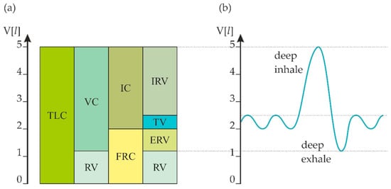 The breathing movements, caused by the muscles, move and hold the air in the airways and lungs. A clinical representation of human retained air is shown in Figure 2 [25,26,27,28], with the following acronyms: Total Lung Capacity (TLC), Vital Capacity (VC), Residual Volume (RV), Inspiratory Capacity (IC), Functional Residual Capacity (FRC), Inspiratory Reserve Volume (IRV), Tidal Volume (TV), Expiratory Reserve Volume (ERV). Relationships between the quantities marked in Figure 2a can be calculated based on ‘A Report of the ACCP-A TS Joint Committee on Pulmonary Nomenclature’ and are presented in Equations (2)–(7) [29]: