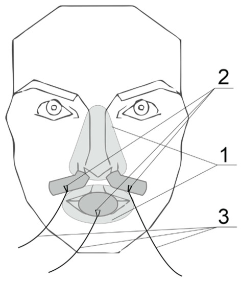 In most measurement procedures, it is not possible to observe the movement of a single molecule that makes up the entire liquid or gas, the flow of which is observed. The exceptions are microscopic measurements of Brownian motion or measurements of the movement of isotope-labeled particles, as well as measurements with isotope contrast agents; absorption (X-ray, CT, MRI) or thermal (such as Transit Time Flow Measurement, especially in cardiovascular surgery) [40,41]. Thus, the measurement of fluid flow, particularly airflow, is considered macroscopically as the overall movement of the fluid; the stream of the measured medium. Pressure, volume or velocity as physical quantities allow the motion and state of a fluid to be described in terms of the conservation of energy and momentum [38]. In the introduction, some respiratory disorders were described as well as the known and widely-used measurement methods by which we can detect them. However, these methods are not sufficient for determining the respiration patency over extended temporal recordings. Long-term analysis is required for the evaluation of breathing disorders like apnea or displacing of the nasal valve. For the correct assessment of these syndromes, a reliable source of data acquisition is required. Therefore, the assessment of URT patency using the recently developed device was proposed [24,42]. Its great advantage is the continuous 3 channel measurement system for all human breathing openings, see Figure 3.
