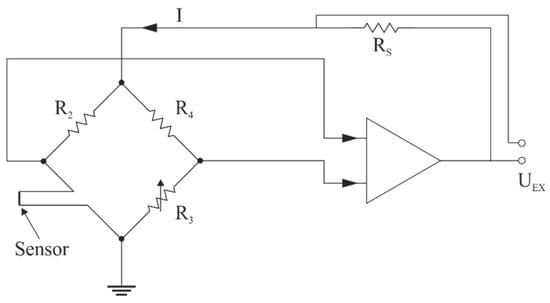 There are two well-known types of thermo-anemometers; the Constant Temperature Anemometer, CTA (Tw = const.), where the temperature of the wire is kept constant, regardless of the speed of the flowing fluid; and the Constant Current Anemometer, CCA (Iw = const.), the principle of which is to maintain a constant current, unchanged during the measurement of the medium flow. Schematic diagrams of bridge systems for both types of thermo-anemometers are shown in Figure 4 and Figure 5.