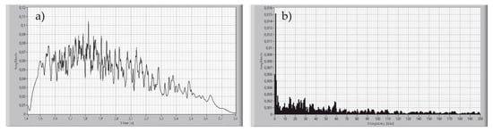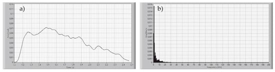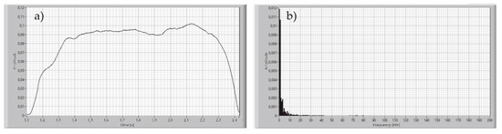 For determining the signal acquisition parameters, the breath of healthy participants was recorded with the proposed device. The sampling rate of the measured signal was set to be 1000 Samples/s. The significant variability of the archived signal resulting from the Fourier transform was 8 Hz for inhale and more than 180 Hz to exhale, as shown in Figure 7 and Figure 8.