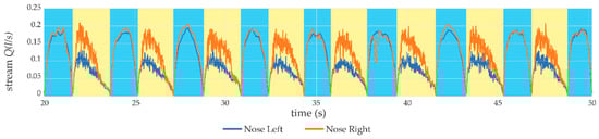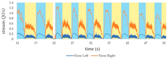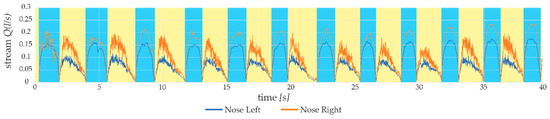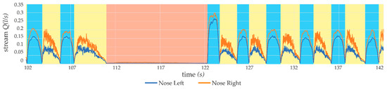 To evaluate the measurement method proposed in the article, a number of tests were carried out to verify the metrological features of the developed device. Measurements of the airflow within the sensors, presented in Figure 10, show the recorded examples of values during breathing for the right and left nostrils. The airflow Q (l/s) is marked on the vertical axis and the elapsed time of the measurement is shown on the horizontal axis. The sampling frequency of the presented trial was set to 2 kHz. As it can be seen, the shape of the graph showing the flow rate of air differs significantly during exhalation and the inspiratory phase. The graph shows the recorded stream for the ‘Nose Left’ sensor with the blue line and the recorded stream for the ‘Nose Right’ sensor with the orange line. Areas marked with a blue background are identified phases of inspiration, while areas marked with a yellow background are recognized phases of exhalation.