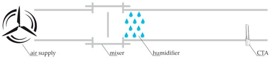 To verify this assumption, a control system was built that simulates breathing with dry air (inhale) and moist (exhale). The constructed system was tested in terms of repeatability of measurements both in a dry environment and after moistening the flowing air. The system consists of a fan (marked as air supply in Figure 11) with adjustable efficiency of the flowing air, a mixer and a humidifier, for the case of moist air measurements. At the end of the measurement path, there is a constant temperature thermo-anemometer (marked CTA) selected for use in the discussed device. In the second phase of the tests, the temperature of the air flowing through the test track (Figure 11) measured near the sensor was 19 °C and the humidity was 94%.