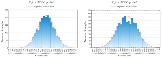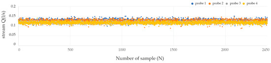 The measured values of the stream presented in the chart (Figure 13) show the distribution of measurement data for one selected sensor—probe 2. To test whether the distribution of samples recorded during a single measurement is consistent with the normal distribution (which is necessary for further tests) the Lilliefors test was used [58]. The Lilliefors test is based on the Kolmogorov-Smirnov test (K-S test), which could not be used due to the large number of samples tested. For the K-S test, it is advisable that the cases were less than 2000, otherwise, it may lead to erroneous results. Additionally, this test requires knowledge of the mean and standard deviation of the population. In the analyzed situation, the above-mentioned parameters are not known. In the absence of this information, the K-S test with the Lilliefors correction (Lilliefors test) is applied. Limiting the number of cases (measurement points) to the number corresponding to the K-S test did not affect the test result, or the determination of the normality of the distribution of samples, additionally the K-S test also requires the feature to be continuous.