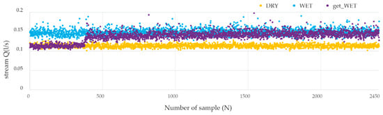 The graph (Figure 14) presents the course of the values for dry air (room humidity, according to the norm [59]), the change of the stream value during humidification, as well as the recorded measurements of the humidified air. The temperature of the air flowing through the test measurement system, measured near the sensor, was 19 °C and the humidity was 94%. Analytical data for the described measurement are also presented below in Table 4. The classes of humidity conditions, in tables are: DRY = 50%, getting WET = 50%→94%, WET = 94% of humidity.