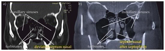 Computed Tomography scan of a patient with deviated septum nasal (a) before surgery; (b) after surgical intervention.
