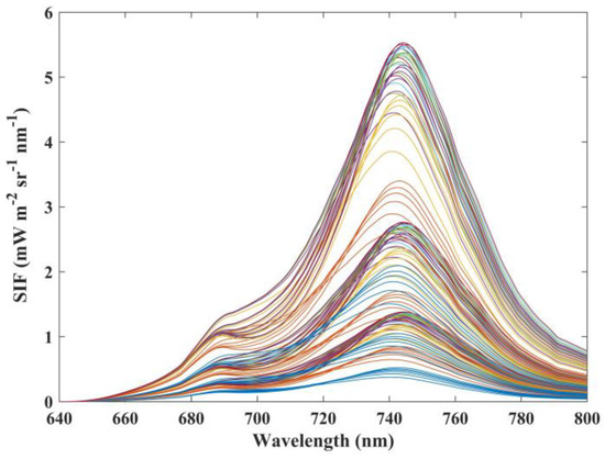 The Soil Canopy Observation Photosynthesis and Energy (SCOPE) [24] model was employed to simulate the emitted fluorescence signals and reflectance of vegetation under 126 different canopy structures and leaf biochemic characteristics. Ten different reflectance spectra over snow and soil surface were derived from the spectral library of the Environment for Visualizing Images (ENVI) [25]. Three constant reflectance spectra were set in the Moderate-resolution atmospheric TRANsmission (MODTRAN) [26,27] model to calculate the atmospheric radiation transfer parameters (L0, LTOC, and S) under 1280 different atmospheric and observation conditions. The input parameters of the two models are shown in Table 2. Figure 1 shows the simulated canopy SIF spectra of different canopy and leaf conditions in the range of 640–800 nm. The fluorescence spectra have a bimodal distribution, with a more obvious peak at around 740 nm.