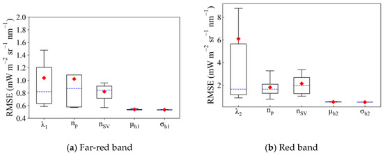 The root mean square error (RMSE) of SIF retrieval when different values for each parameter were set. The influence of each parameter was investigated when other parameters were set as their default values, i.e., μh1 = 740 nm, σh1 = 30 nm, μh2 = 688 nm, σh2 = 10 nm, np = 3, nSV = 11, λ1 = 730 nm, and λ2 = 691 nm (SNR = 322). The horizontal bar in blue represents the median, diamonds in red represent the average, and the box bar covers 50% of the RMSE values. RMSE values that do not fall within the upper and lower limits of the boxplot are excluded as outliers.