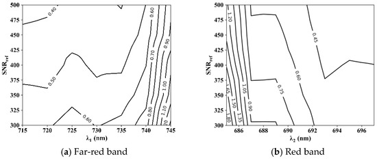 The root mean square error (RMSE) of (a) far-red and (b) red SIF retrieval using different fitting windows (λ1—758 nm at far-red band and 682—λ2 nm at red band) and simulation datasets with different SNRs. Other parameters listed in Table 4 are arbitrarily changed, and the minimal value of the RMSE is taken.