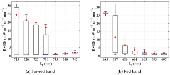 The RMSE of SIF retrieval in different (a) far-red and (b) red fitting windows (λ1—758 nm at far-red band and 682—λ2 nm at red band) when the other parameters in Table 4 arbitrarily change (SNR = 322). The horizontal bar in blue represents the median, diamonds in red represent the average, the box bar covers 50% of the RMSE values, RMSE values that do not fall within the upper and lower limits of the boxplot are excluded as outliers.