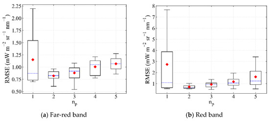 The RMSE of SIF retrieval in the optimal (a) far-red (735–758 nm) and (b) red fitting windows (682–697 nm) with different polynomial orders when the other parameters in Table 4 arbitrarily change. The horizontal bar in blue represents the median, diamonds in red represent the average. The case where np is 5 in the far-red fitting window is excluded for the abnormal RMSE value with an average of 17.14 mW m−2 sr−1 nm−1.