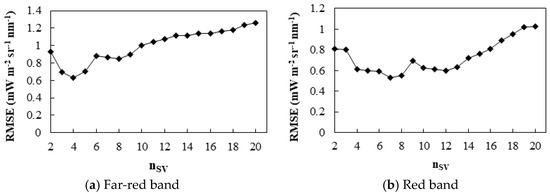 The RMSEs of different numbers of feature vectors were evaluated (Figure 7). The accuracy of SIF retrieval decreased first and then increased with the increase in nSV in both the far-red and red fitting windows as too many feature vectors over-fit the random noise of the sensor. For far-red SIF retrieval, nSV was set as 4 with a minimal RMSE of 0.63 mW m−2 sr−1 nm−1, while for red SIF retrieval, nSV was set as 7 with a minimal RMSE of 0.53 mW m−2 sr−1 nm−1.