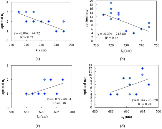 Our results showed that in far-red fitting windows, there was an obvious positive linear correlation between window width and the optimal np and nSV, with an R2 of 0.71 and 0.46 respectively, which means that a larger number of feature vectors and polynomial orders are preferable in wider fitting windows. In the red band, the SIF signal was weaker and more affectable by the random noise. Thus, for red SIF retrieval, although the optimal np and nSV still had a positive linear correlation with the width of fitting windows, the correlation between λ2 and the optimal np or nSV was lower than that of far-red fitting windows with the R2 of 0.24 and 0.38 for the relationship between λ2 and the optimal np and the optimal nSV, respectively.