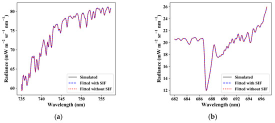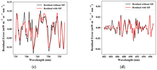 We also evaluated the fitting accuracy of the reconstructed radiance spectra between 735–758 nm and 682–697 nm with and without the filling of fluorescence under an SNR of 322, as shown in Figure 10. Figure 10 also shows excellent fitting accuracy of the forward model to reconstruct the TOA radiance. The residual value was less than 0.11 mW m−2 sr−1 nm−1 for far-red SIF retrieval and less than 0.04 mW m−2 sr−1 nm−1 for red SIF retrieval. The forward model fitted with SIF fit the radiance better with a lower residual error.