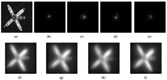 The image is degraded by the point spread function. (a) is the original image. Resolution is 128 × 128. Point Spread Functions are shown in (b–e). Degraded images corresponding to the (b–e) are shown in (f–i).