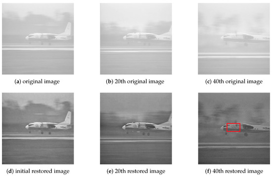 Figure 5 shows the frames from one video sequence of a flying plane. This paper converts the frames in the video sequence to 256 grayscale for convenience and sheared the images to 256 × 256 pixels. Figure 5a is the initial frame. This paper sets the parameters as , , , , . Through 200 iterations of the algorithm, we obtain Figure 5d. At this time, the picture quality was not improved significantly. The goal of this step is to obtain an initial estimate. Figure 5b is the 20th frame of the sequence. BDA-SF iterates Figure 5e 40 times to get Figure 5b. At this point, we can vaguely see numbers on the fuselage of the plane. The picture quality has improved to some extent. Figure 5c is the 40th frame of the video sequence. Restoring Figure 5c obtains Figure 5f. The picture quality was greatly improved. We can see the number “126” on the fuselage. With the deepening of iteration, BDA-SF can restore the image sequence efficiently. The most time-consuming part of the algorithm is the Fourier transform. The complexity of the algorithm is . The simulations are carried out on Windows 10 with an Intel Core i5-7200U CPU at 2.7 GHz with 12 GB RAM. The algorithm takes about 0.04 s per iteration to process the 256 × 256 image. Using the previous frame as the initial estimate can save many iterative steps and improve the algorithm’s efficiency.