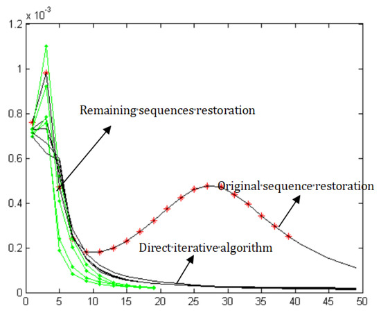 Figure 6 shows the iterative curve. The horizontal axis represents the number of iteration, and the vertical axis is the residual. The black line is a direct iterative algorithm. The curve marked by a red star represents the first stage of the algorithm. The first stage of restoration did not arrive at the optimal point, but this does not matter; all we need is an initial estimate. The next step needs a few iterations, and the green line represents the second step of the algorithm. BDA-SF can achieve convergence with only a few iterations—no more than 20. Although the first step requires lots of iterations, it reduces the number of iterations needed for later work.