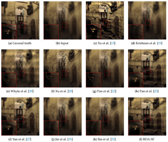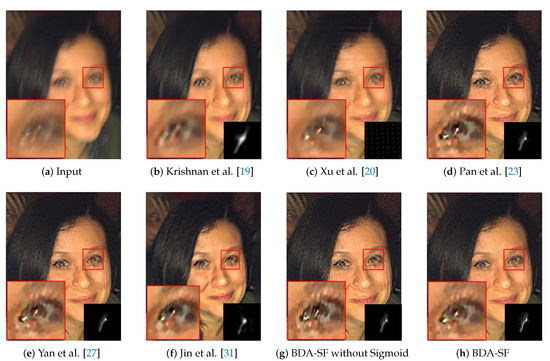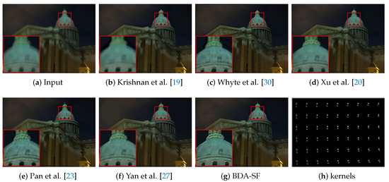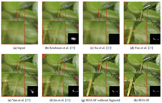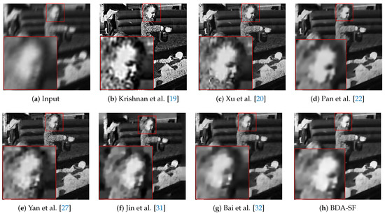 To better evaluate the effectiveness of the sigmoid function, this paper selects severely degraded images from public datasets [18,57]. Methods involved in the comparison are Xu et al. [15], Krishnan et al. [19], Whyte et al. [30], Xu et al. [20], Pan et al. [23], Pan et al. [22], Yan et al. [27], Jin et al. [31], Bai et al. [32]. Figure 11 and Figure 12 show the results. This paper uses evaluation indexes PSNR and SSIM to evaluate the image quality. Table 1 and Table 2 demonstrate that BDA-SF using sigmoid function can achieve a state-of-the-art performance on severely degraded images.