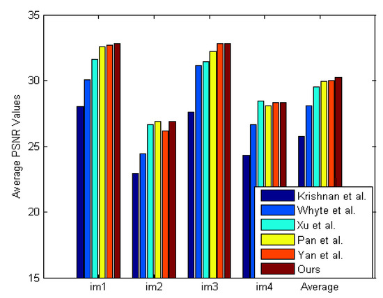 In recent years, significant progress has been made in image deblurring [13]. In particular, using the prior information of the image to deblur has attracted significant attention from academics. Many contributions reported in the literature are based on maximum a posterior (MAP) framework and variational Bayesian methods [14,15,16,17,18,19,20,21,22,23,24,25,26,27,28,29,30,31,32]. These methods often involve two steps. In the first step, the blur kernel is estimated by using the obtained image. The second step is to estimate the latent image according to the estimated blur kernel through a non-blind deconvolution method [33,34,35,36]. Considering that the simplest MAP method cannot always estimate the blur kernel effectively, it is not easy to obtain a satisfactory image.