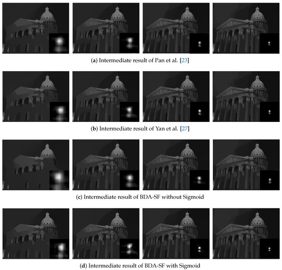 Deblurred results and its corresponding intermediate results over iterations. With the Sigmoid function, the proposed BDA-SF achieves intermediate results containing more sharp edges. The use of the Sigmoid function makes the results contain sharper edges and texture features.
