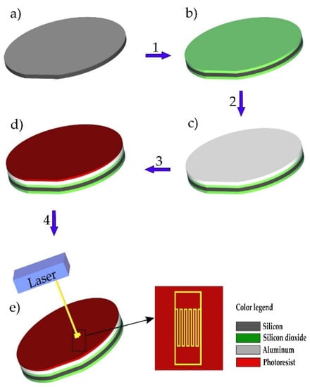 Depiction of the fabrication procedure: (a) Starting wafer; (b) thermal oxidation of the silicon wafer; (c) sputtering of aluminum 1% silicon; (d) spin coating of the photoresist; (e) exposure to laser light.