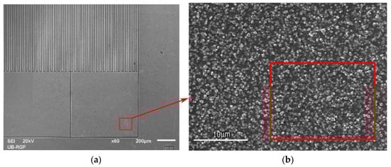 (a) SEM image of the sensor, scale bar 200 µm. (b) SEM image, scale bar 10 µm, with a marked area where EDS analysis was performed.