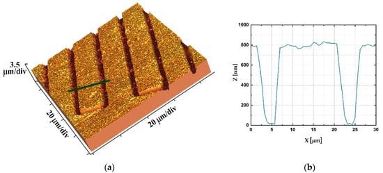 (a) 3D AFM image of the sensor detail; (b) profile obtained via AFM along the line marked as green in (a).