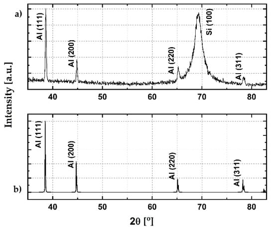 Structural characterization of the sputtered material was conducted via XRD analysis. Measurements were performed on the Rigaku Ultima IV with Cu target (Kα radiation, λ = 0.154178 nm) (Rigaku, Tokyo, Japan). The theoretical pattern was calculated using the VESTA software [24]. As input for the calculation, a face-centered cubic cell with a 404 pm lattice constant was used [25]. The experimental pattern is presented in Figure 5a, together with the theoretical diffractogram in Figure 5b. The peak at 2θ of 38.6° originates from the reflection from the Al (111) crystalline plane. The lower-intensity peak at 2θ of 44.9° originates from the reflection from the Al (200) plane. There are two low-intensity peaks at 2θ of 65.3° and 78.3° which originate from the reflections from the Al (220) and Al (311) planes, respectively [26,27]. The high-intensity peak at 2θ of 69.4° originates from the reflection from the Si (100) plane [28]. By comparing peak intensities from theoretical and experimental diffractograms, it can be concluded that the (111), (200), and (220) planes are equally present, while the (311) plane is 50% less abundant. The crystallinity index was calculated at a value of 0.85.