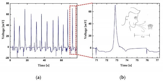 (a) Sensor’s response to periodical human exhalation from a 10 cm distance; (b) response to a single breath blow.